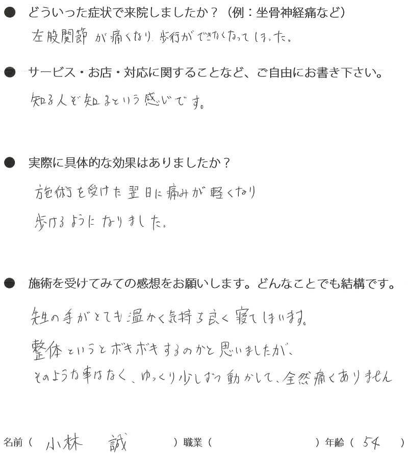 整形外科の薬も飲んでいたため、何が効果があったのかはわかりませんが、1回目に来院した次の日に痛みが強くなったものの、2日目にびっくりする位痛みがなくなり、びっくりしました。教えていただいた体操のおかげか、右腰にかけてのだるさもなくなり、とても楽になりました。