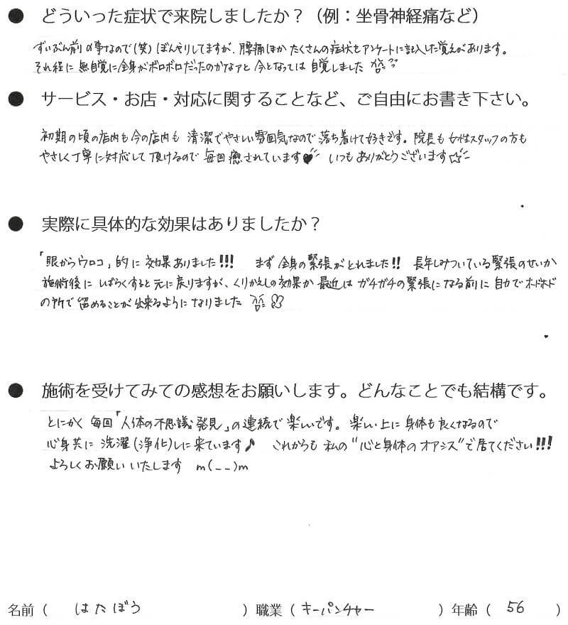 2年前から通って下さっています。いつも施術の時は、笑い声が施術室に響きますね。(笑)